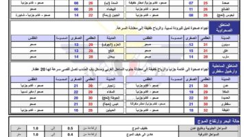 – الرياح السطحية: جنوبية غربية نهارًا، سرعتها بين 10 و35 كلم/س.