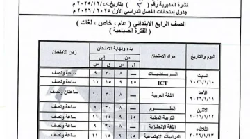 جدول امتحانات الصف الرابع الابتدائي للفصل الدراسي الأول 2026 في محافظة المنيا